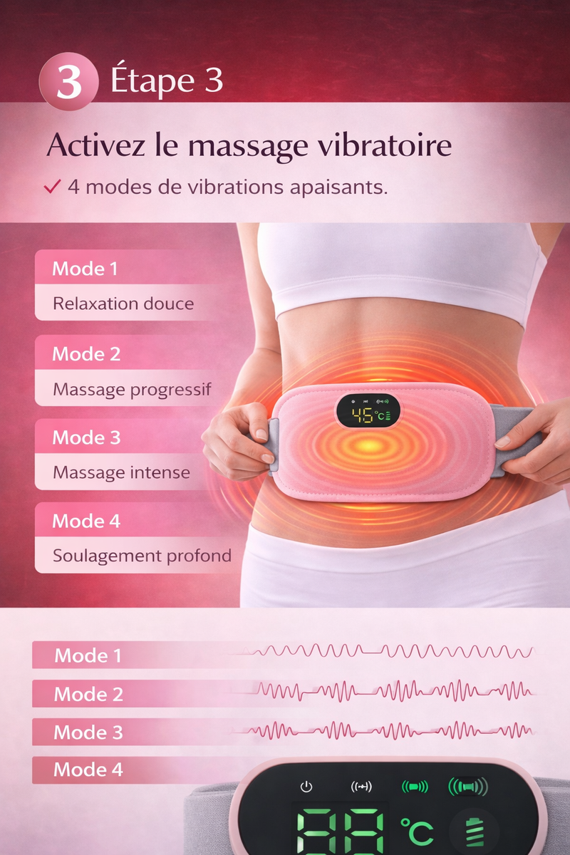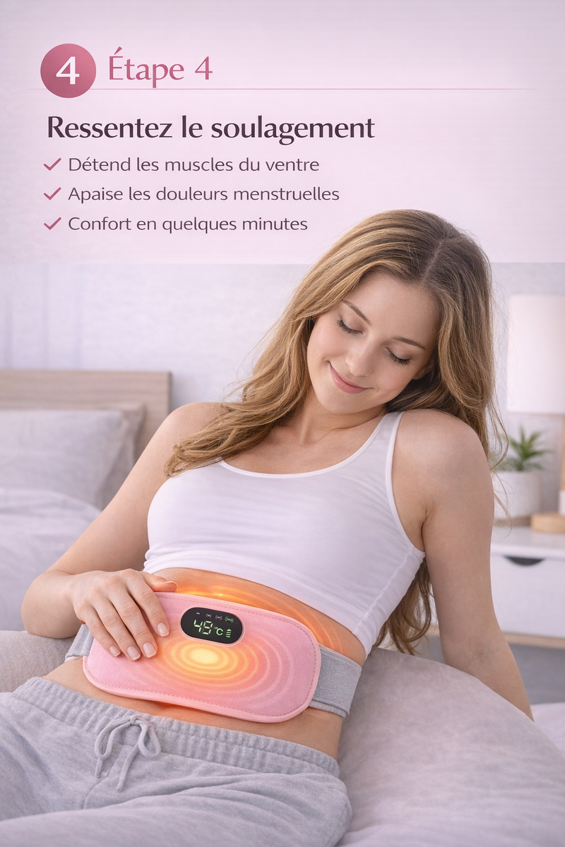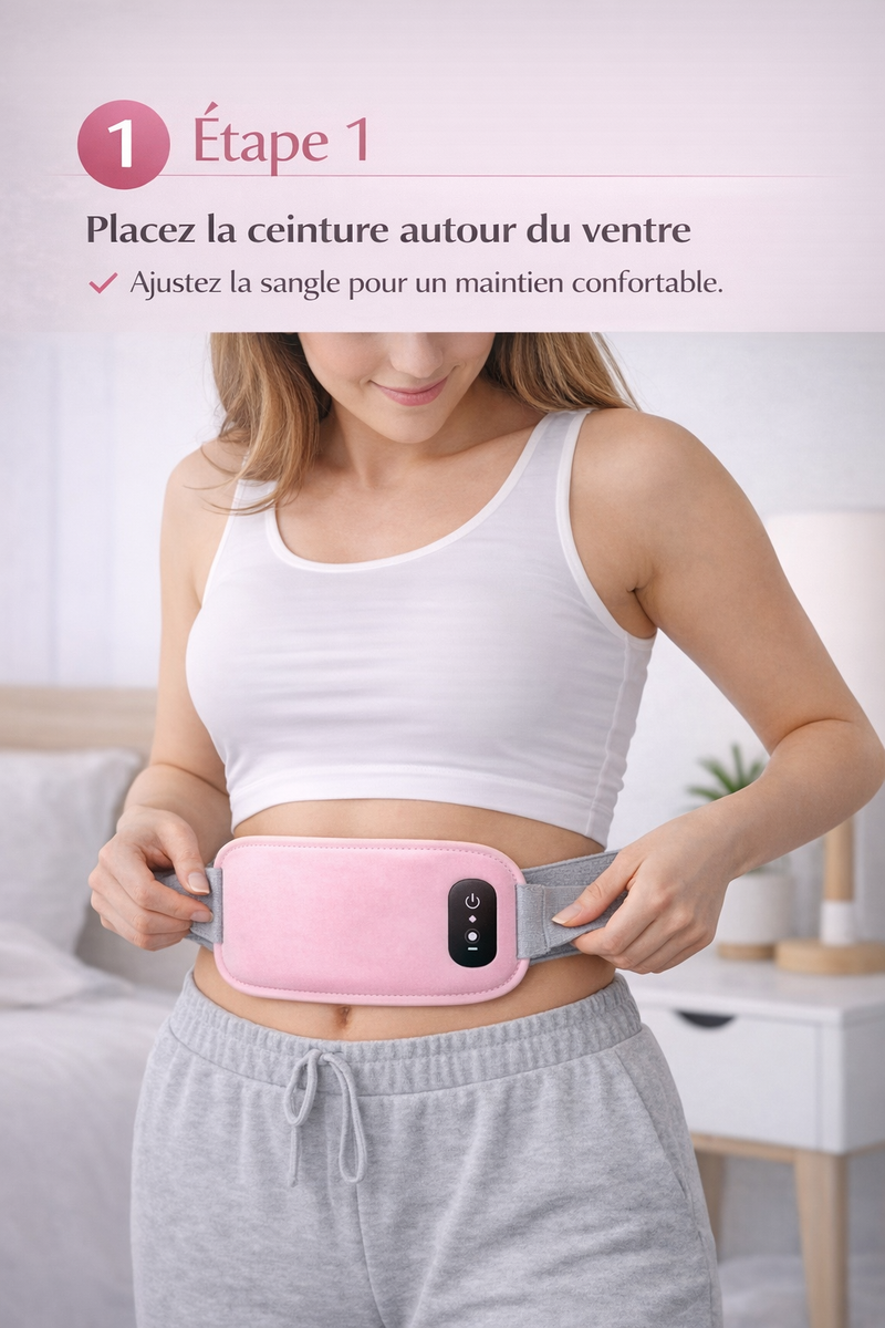 Soulagez rapidement les douleurs menstruelles grâce à la chaleur réglable et au massage relaxant de la ceinture Calmyra™. Confortable, ajustable et facile à utiliser, elle aide à réduire les crampes, détendre les muscles et retrouver du bien-être en quelques minutes.