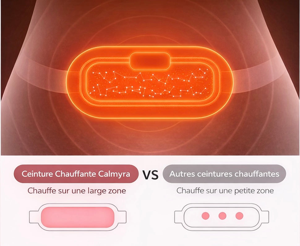 Grâce à sa technologie thermique avancée, la ceinture chauffante Calmyra diffuse la chaleur sur une zone jusqu’à 90% plus large que les ceintures classiques.
